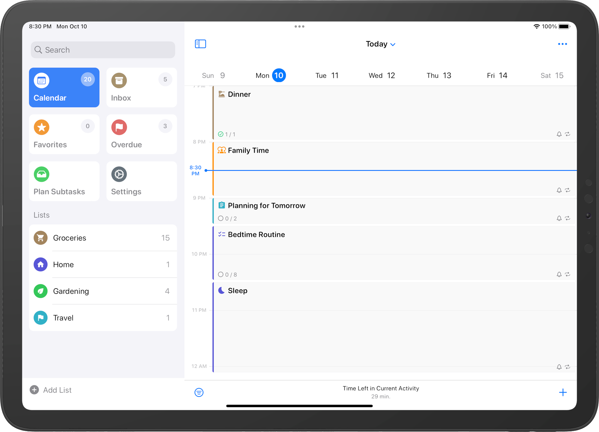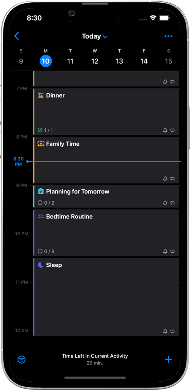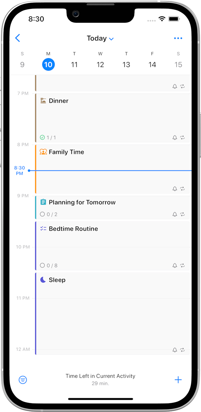 Add the tasks on the activities and events that you planned for the day. Say goodbye to long, overwhelming to-do lists.