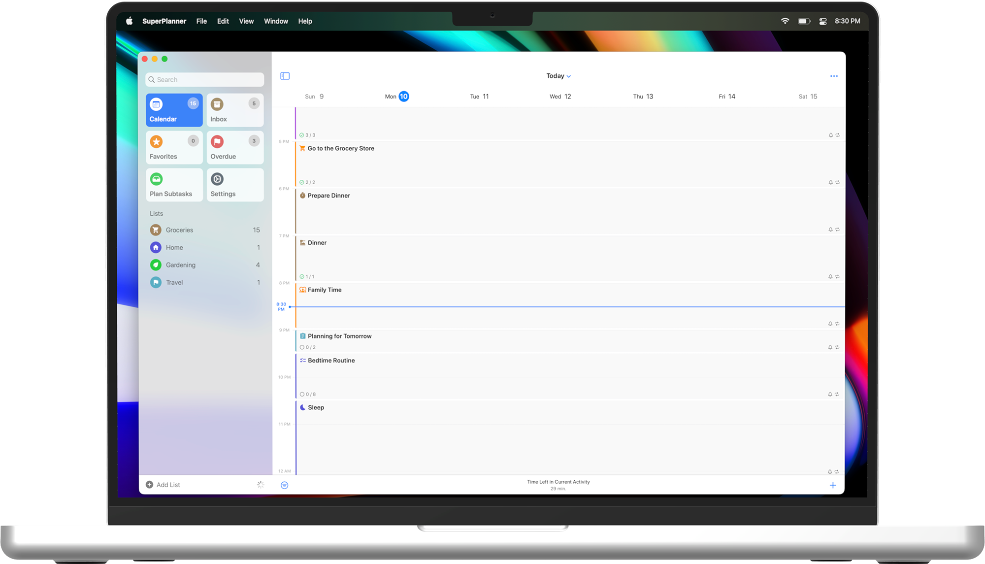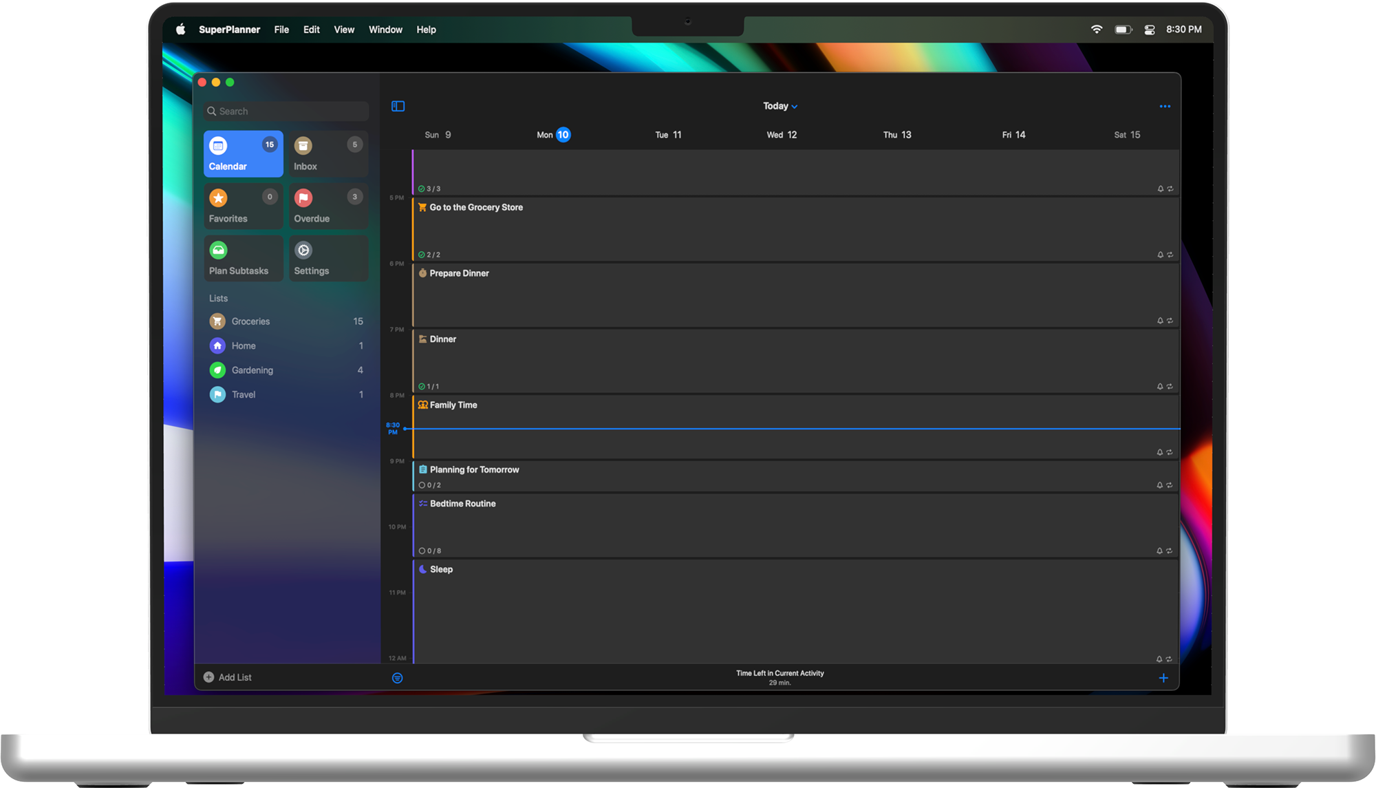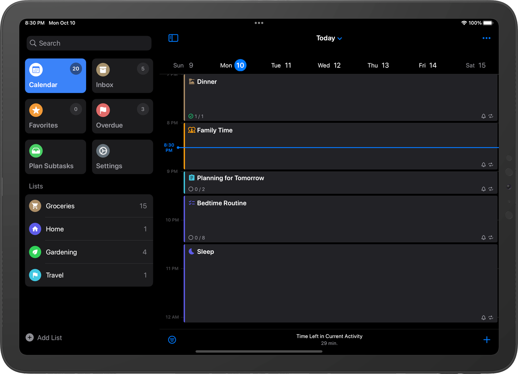 Add the tasks on the activities and events that you planned for the day. Say goodbye to long, overwhelming to-do lists.
